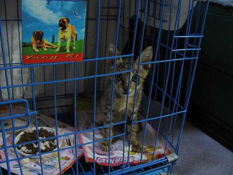 给他先放到笼子里,以免跟我家另外八只宝贝接触.然后给他喂了点猫粮,知道他是流浪